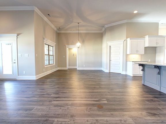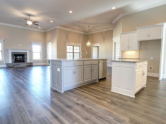 All brick Cambridge Plan D is an open plan with a 3 car side entry garage backed by a 2-10 home warranty.. Home has 4 bedrooms, 3 baths and a sunroom. Home has wood plus flooring (Mohawk Revwood) in all living areas and bedrooms. Great Room features 12' ceiling, extensive trim, gas-log fireplace with upgraded fireplace treatment, wood plus flooring, floor outlet, recessed lights and ceiling fan. Dining room has 10' coffered ceiling, wood plus flooring, extensive trim including shadow box under chair rail. Open Kitchen includes 12' ceiling, custom cabinetry and granite countertops, large island with countertop seating, second prep island, stainless appliances including dishwasher, gas cooktop wall oven and wall microwave, tile backsplash, wood plus flooring, recessed lighting, huge walk-in pantry, and drop zone bench. Breakfast has 12' ceiling, wood plus wood flooring and extensive trim. Master bedroom has 11' double tray ceiling, wood plus flooring, recessed lighting, extensive trim and ceiling fan. Master bath has 11' ceilings, glamour tub, large corner tile shower with two shower heads and rimless door, separate toilet area, large double vanity with granite, huge walk-in closet and access to laundry. Large sunroom has vaulted ceiling, wood plus flooring and ceiling fan. The additional bedrooms have 9' ceilings, ceiling fans, crown molding and wood plus flooring. The additional baths have 9' ceilings, tile flooring and granite counter tops. Laundry has 9' ceilings, custom ca