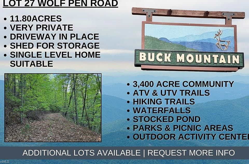 Looking to escape the hustle & bustle of daily life? This 11.8 acre tract offers tranquility, privacy & seclusion. Conveniently located in 3,400 acre Buck Mountain...ONLY GATED ATV COMMUNITY in Wilkes County. Lots of this size are a RARE FIND in Buck Mtn! Easily accessible by existing driveway. Multiple building site options. Select the perfect spot for your weekend getaway or rental property. Long & short-term rentals allowed. FIBER OPTIC available. Near Outdoor Activity Center w/pavilion, fire pit, picnic tables, bathrooms, amphitheater for live music, community gatherings & more! Buck Mountain is only 1 hr from Winston & 1 hr 40 min from Charlotte. Centrally located 35 min from Boone, West Jefferson & Wilkesboro. Close to BLUE RIDGE PKWY, ASU, shopping, dining, golf, mtn biking, fishing & skiing. Buck Mtn offers miles of Trails, Parks, Fishing Pond, Waterfalls, Pavilions, Community Ctr, Helipad, & more! 1,400 SF min. NO TINY HOMES. NO MOBILE HOMES. NO CAMPING. NO SELLER FINANCING.