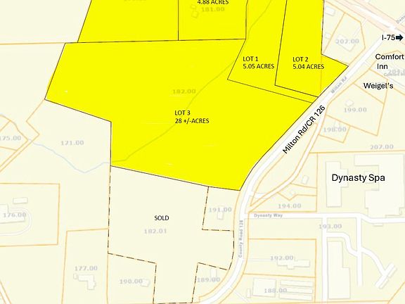 Property is adjacent to Comfort Inn and Weigel's. Has Access from Milton Road/County Road 126. Can access if Lot 1 (5.05 acres) and/or Lot 2 (5.04 acres) are purchased.