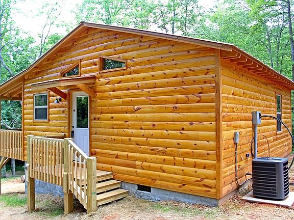 This BRAND NEW CABIN will be built for you! Enjoy a split floor plan offering 2 bedrooms and 1 bathroom with ample space for comfortable living. Stunning D Log siding and metal roof make for striking rustic appeal, while the covered front porch offers a perfect spot to unwind. Inside boasts an inviting open floor plan, with plenty of natural light flooding through the windows of the spacious Great Room with custom stone fireplace. The kitchen has beautiful cabinets with granite countertops to provide elegance and comfort. Hardwood floors and T&G wood throughout bring a touch of warmth and ambiance to your home. You can choose from 2 more plans, including a 2/2 with 1008 square feet or a 2/1 864 sq ft. Pictures depict a finished, lived in home-appliances and personal property not included.