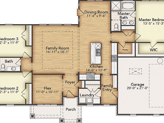 The Cibolo is a perfect example of how you can make a few adjustments to a floor plan to completely change the way it looks! We offer three options for the exterior?Craftsman, Farmhouse, and European?so you can choose your architectural preference. Inside, the 2,033-square-foot plan is designed with the busy family in mind. Keep all the main living concentrated in an open floor plan where walls don't divide you. Whether you're watching television in the large family room, entertaining in the dining room, or handling the kitchen duties, you can see everyone and everything. The kltchen's center island functions like a hub. Sit down for a casual meal at the breakfast bar, sort the mail, catch up on the daily happenings, wash the dishes, or start prepping the next meal. Adjacent to the kitchen, you have the functional center of the home: mudroom and laundry. A hall bench and closet provide you with the organization you need to keep the clutter at bay. Your master suite is tucked away in the farthest corner of this single-level floor plan. Separated with a vestibule entrance, you have a private retreat. The master bath includes both a soaking tub and walk-in shower, plus dual vanities and a private water closet, so it's very shareable. The other 2 secondary bedrooms of this split floor plan anchor the other side of the home where they share the second full bath. Both bedrooms are identically sized with plenty of space for anyone from a toddler to teen to another ad...