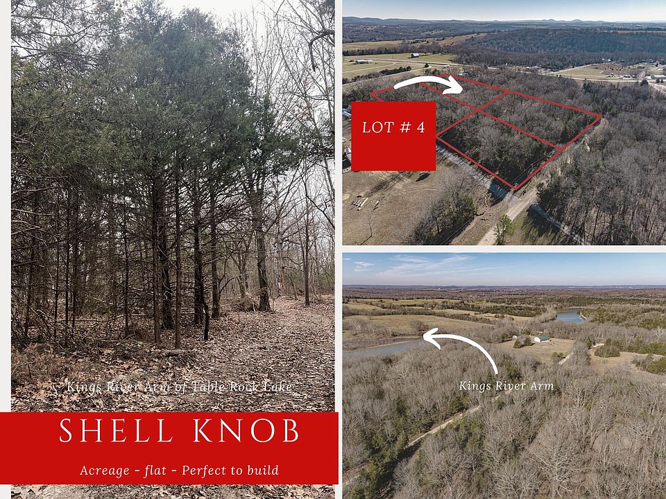 Gorgeous lot #4 next to the Kings River-Table Rock Lake region, with rich soil to grow a beautiful flower garden or vegetable garden or fruit trees. You can have your country lot and build on it too! These 1.35 acre lots are a must see as they flat and a perfect backdrop for your dream home, workshop or barn-dominium; with mature trees and partially cleared, you can start building and have a place to store your water toys. Purchase one lot or all four - it's up to you and what you need.