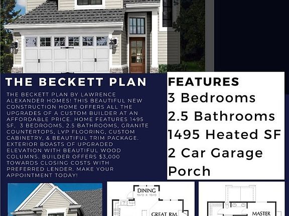 The BECKETT Plan by Lawrence Alexander Homes! This Beautiful New Construction Home Offers All the Upgrades of a Custom Builder at an Affordable Price. Home Features 1495 SF, 3 Bedrooms, 2.5 Bathrooms, Granite Countertops, LVP Flooring, Custom Cabinetry, & Beautiful Trim Package. Exterior Boasts of Upgraded Elevation with Beautiful Wood Columns. Builder Offers $3,000 Towards Closing Costs with Preferred Lender. Make Your Appointment Today!