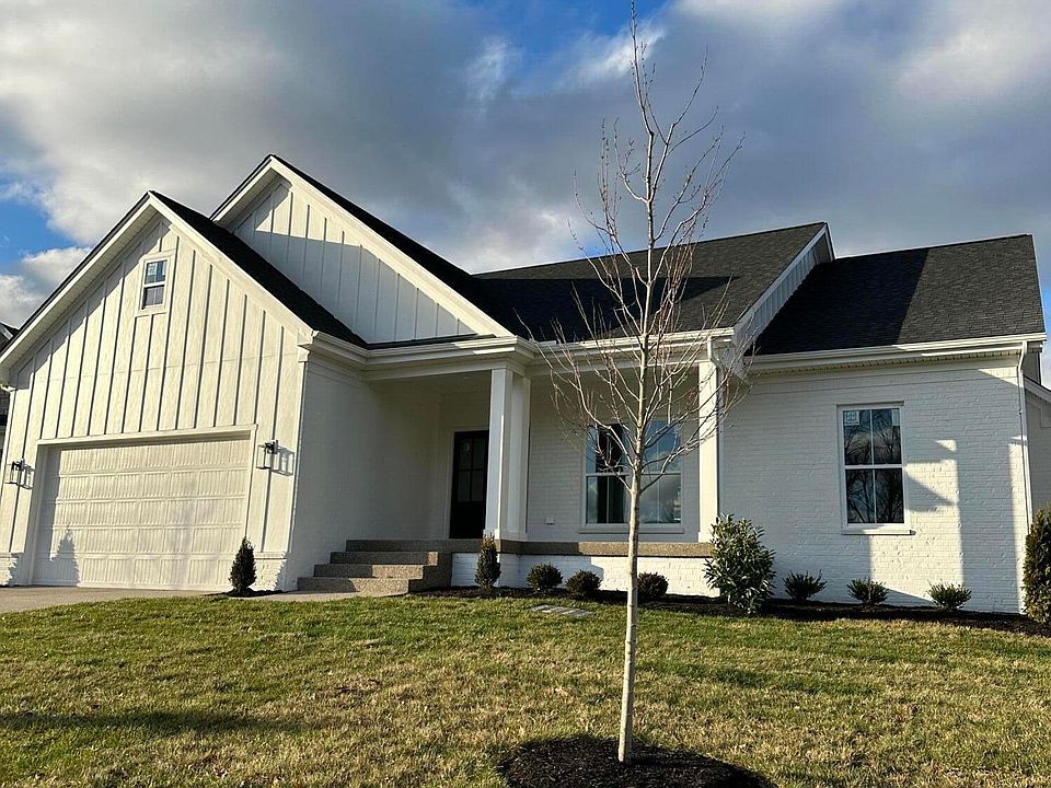 BRAND NEW open and airy one floor plan situated nicely in a wonderful neighborhood, The Woods at Landherr. Quite spacious 1st fl master suite with private bath that has double vanity, large shower and tiled flooring. 2 other bedrooms at main level . Kitchen with island for additional seating, plenty of counter space , gorgeous white cabinetry, pantry, and great area for your dining table all opens up to a cozy great room with fireplace.Good sized laundry room and plenty of closets throughout this new home. 9 ft ceilings, mud bench with cubbies convenient for families on the go .Basement has a bathroom roughed for future finish if desired. Fantastic curb appeal with the lovely brick plus board and batten for accent.Don't miss out!! Call today to make this new home yours and you'll be able to customize your selections to your taste!
