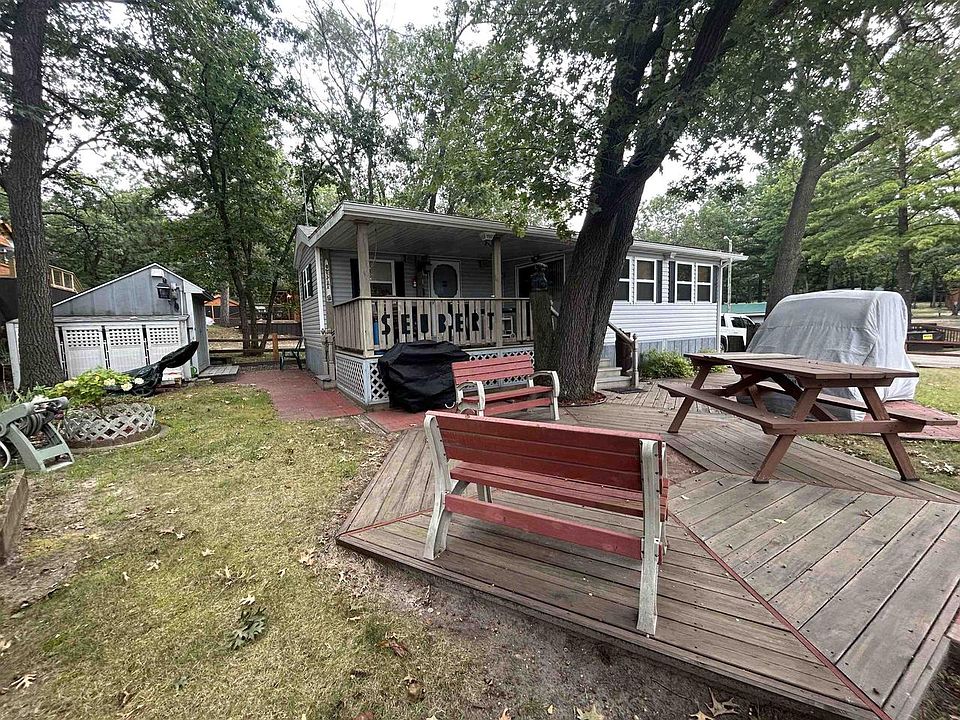 Well maintained 1991(Dutch Park) park model on corner lot. 10x16 living room added on. 10x16 covered front porch. 2 parking spots east of park model.