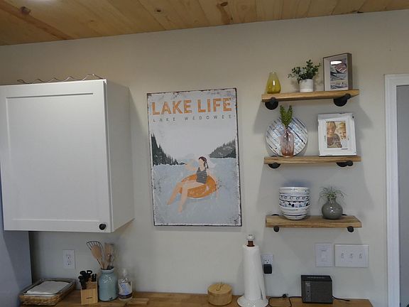 The "Lake Wedowee Tree House" is located on the South end of Lake Wedowee with 147 feet of shoreline with year round water. This cute cabin offers a family room with a vaulted pine ceiling, ship lap walls with an electric fireplace. The cozy kitchen has white cabinets with a cool modern color refrigerator. There are plenty of windows with awesome views of the lake. There is a sleeping loft that over looks the family room. This cabin needs a bathroom installed (CURRENTLY NO BATHROOM ) to enjoy the lake life while you build your lake home. There is a poured concrete basement and foundation ready to build, with a new drilled well and septic system installed. This property has a lot of potential. It is and easy walk to the water with steps and decks leading to the gazebo and stationary dock. This is a great opportunity to build your own lake house. You are located minutes from large open water but protected in a large private cove with very little boat traffic.
