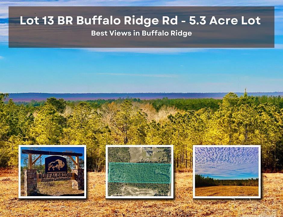 BEST VIEWS IN BUFFALO RIDGE!!! 5.3-acre Lot 13 BR with dimensions 871 x 265 feet is located on the HIGHEST POINT OF BUFFALO RIDGE COMMUNITY. This homesite has about 1 AC clearing which would be an ideal spot for the main house and additional outbuildings. There is a long long 200 ft driveway cleared from Buffalo Ridge Rd all the way to the clearing. From the clearing you get spectacular views of Escambia River valley. If you are one of the Buffalo Ridge buyers who missed out on the opportunity to purchase a parcel with great views on the paved road, now it's your chance. This is a ONE-OF-A-KIND PARCEL!!! Don't wait too long and schedule your showing today. Some of the rarest land in Northwest Florida is now available for you to own in the planned community of Buffalo Ridge. Enjoy rolling hills, flowing creeks, beautiful oak trees, grassy meadows, and the unique serenity Buffalo Ridge Phase 5 parcels provide. Buffalo Ridge is located only minutes away from the convenience of Pace shopping and local restaurants. Situated on one of the highest points in Santa Rosa County, Buffalo Ridge provides twenty-mile views. The community has paved & curbed roads and AT&T fiber optic. Buffalo Ridge is designed to be a responsible residential development preserving West Florida natural beauty and wildlife. This special neighborhood offers privacy with convenience and provides stunning sunset views from its high elevation. Buffalo Ridge is situated about an hour away from The Gulf of Mexico including popular beach resort communities such as Pensacola Beach and Perdido Key.