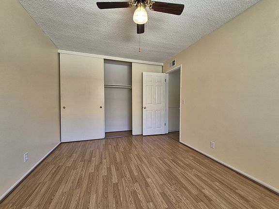 Triplex home with enclosed patio, cul-de-sac. Storage. Primary bedroom. built-in closet with drawers wall to wall, with storage above. Updated mid bath. Only 2nd bedroom wall attached to neighbor.NO HOA.