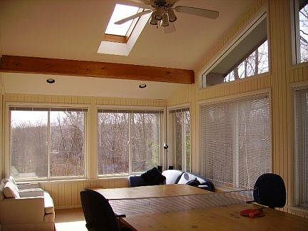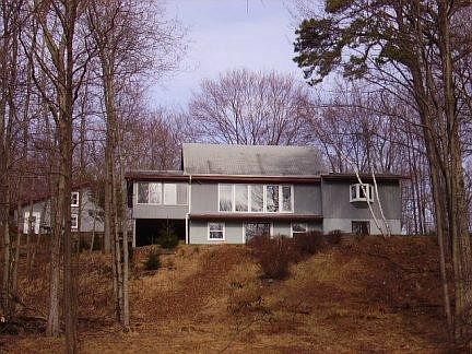 Enjoy the spectacular views of nature at its best from the sun filled LR/DR w/cathedral ceilings. This spacious 5 BR/2.5 BA, contemporary saltbox boasts sunroom/game room w/skylights, FR, studio/work shop, laundry, storage, 2 car detached garage and all on over an acre of property in an amenity filled community. This is a "Midsummer Nights Dream"; bordering a gushing stream. Sq. ft. is appx.