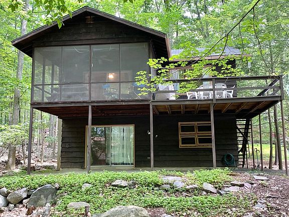 Short walk to swim area in Rockledge. This 2nd Tier Home features an open floor plan including eat in kitchen and living room with stone fireplace and knotty pine interior with a vaulted ceiling. This rustic vacation home offers a den with stone fireplace that can be used as a 5th Bedroom if needed, 4 Bedrooms, 2 Full baths and a second level deck plus a screened porch. A Boat slip is included and is sold mostly furnished.