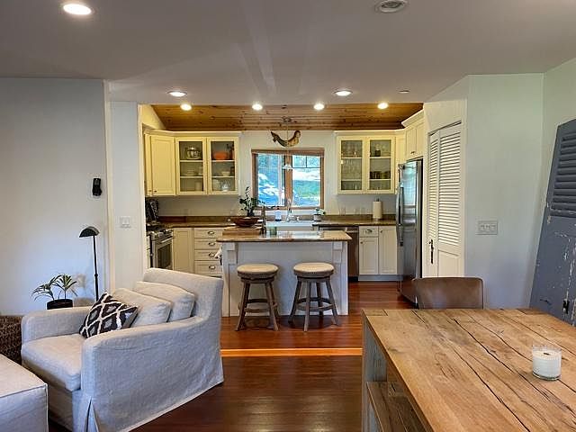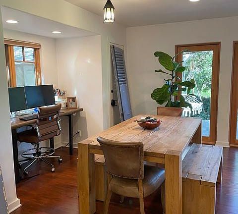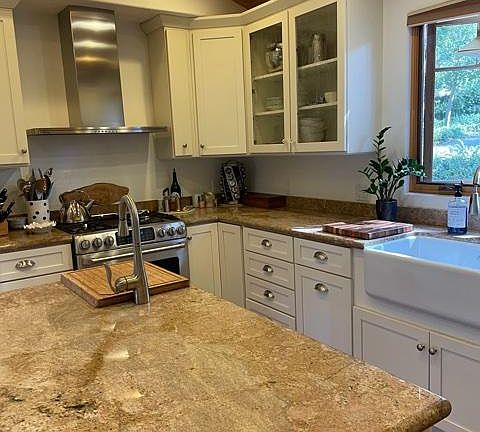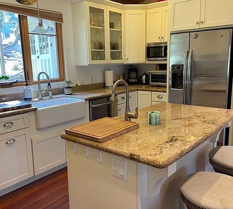 Charmingly remodeled three bedroom, two bath home in the heart of Carmel-by-the-Sea's "Golden Rectangle." Walk to town and to the beach. Approximately 1,640 square feet. Enter into a tiled foyer to wood floor hallway which leads to an open floor plan living area. The living room has hardwood floors, a gas log fireplace/furnace, recessed lights, and French doors that open to the deck overlooking the backyard. The kitchen has granite counters with a center island, stainless steel appliances (side by side refrigerator, dishwasher, gas range, and microwave). The downstairs bedroom has hardwood floors and French doors leading out to the deck. The downstairs bath has porcelain tile floors, two pedestal sinks, and a tub/shower combination. The master bedroom features a vaulted pinewood ceiling, two closets, and french doors onto a small balcony. The third bedroom is also located upstairs and features a beautiful picture window with lots of natural light and a vaulted pine ceiling. The second bathroom features a wood floor and a shower stall. The washer and dryer are located in a laundry room off the kitchen area and are left as a courtesy. There is a single car garage for storage. Please note: The owner uses a small back wall of the garage for storage. Off-street parking available in driveway. A gardening service is provided. There is a guest house on the property that is solely for owner use. Owner use of guest house is occasional. No smoking. Pets negotiable. The owner pays for a monthly gardening service. All other utilities are paid by the renter. Pets negotiable.