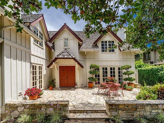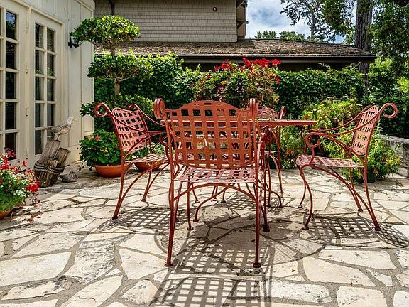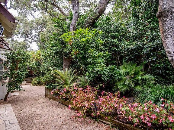 In the Golden Rectangle, minutes from the beach! Hummers Haven features spacious rooms, skylights, and wood beam ceilings. The kitchen includes a fireplace and has french doors that open to an outdoor patio, a perfect place for entertaining. The dining room features a built-in bar with a sink and french doors that open to the garden. The beautiful living room has wood flooring, a cozy Carmel Stone fireplace, two sets of french doors that also open to the beautiful garden and patio. In addition, the main floor includes an office/4th bedroom, laundry room and a full bathroom. Upstairs, the master suite has a large outdoor patio that is a wonderful place for enjoying the sound of the ocean. The window seat in the master suite is perfect for enjoying a good book. A spacious bathroom includes double sinks, jet tub, and shower. There are two additional bedrooms on the second story and a full bath. The home has an attached, oversized garage and room for parking inside the gate.
