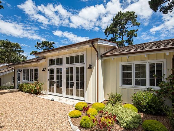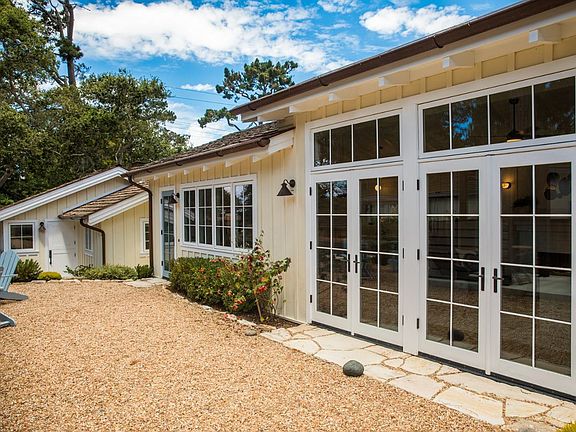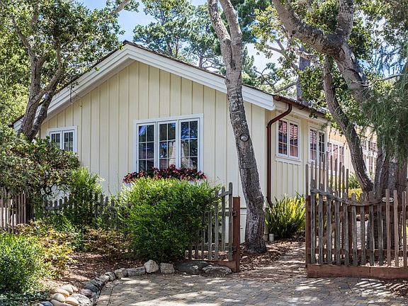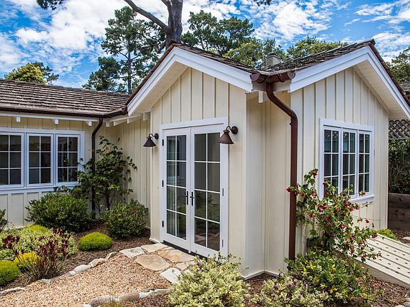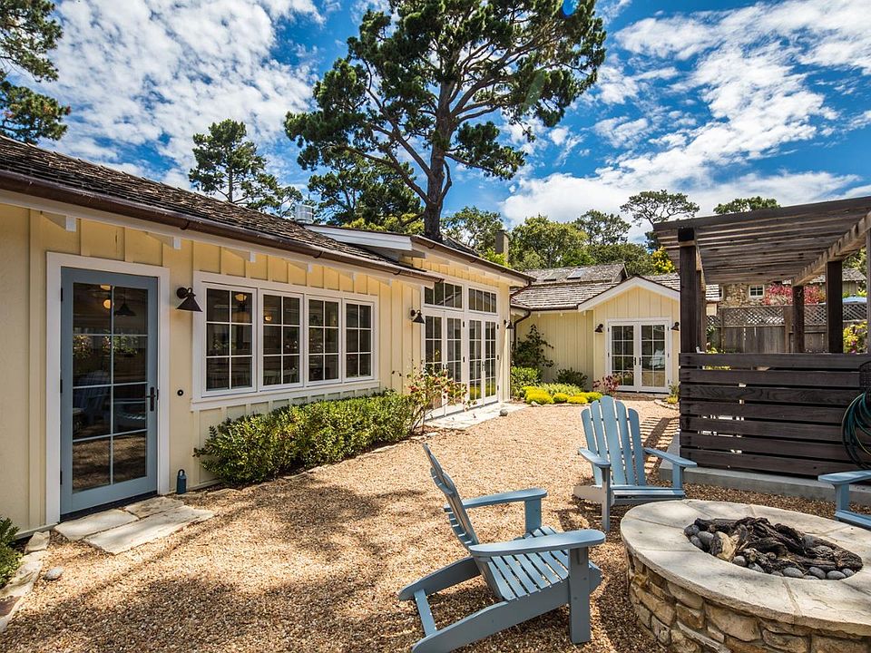 Sun pours in through an array of south facing windows in this Golden Rectangle Classic Carmel cottage with style & joy: board and batten walls, vaulted ceilings, hardwood floors, marble counter tops, all new and up-to-date while retaining the flavor of Old Carmel. Great room layout combines kitchen, dining, and living room spaces with fireplace and two sets of French doors opening to the sunny garden. Four bedrooms and two full baths. Large master suite has a second fireplace and an ample sitting area that could be an office or library. Indoor laundry with new Bravos XL washer & dryer. The meticulous garden with firepit runs the length of the lot on the sunny south side. A handsome trellis sits in the center of the garden offering the opportunity to plant vines of ones choice. Great place to sit and enjoy a glass of wine with friends. BBQ area. Raised flower beds. Short walk to beach and the village. Carmel Bright is the Sunny Side of the Street.