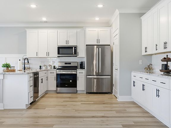Large breakfast islandSpacious walk in pantryLuxury vinyl plank flooringTile backsplashOpen concept layoutGenerous laundry roomCrown molding