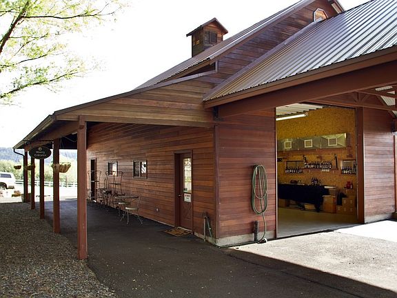 Former Gilstrap Winery Building, covered open air patio, grass event parking, and Kuhlman Foch French grape vineyard (1.7 acres). Picturesque cedar building, metal roof, detached storage building, 2 carports, paved driveway & walkway. Office with private entry, bathroom, 2 working areas. Peaceful & serene mountain views. Use your imagination for a fabulous business opportunity.
