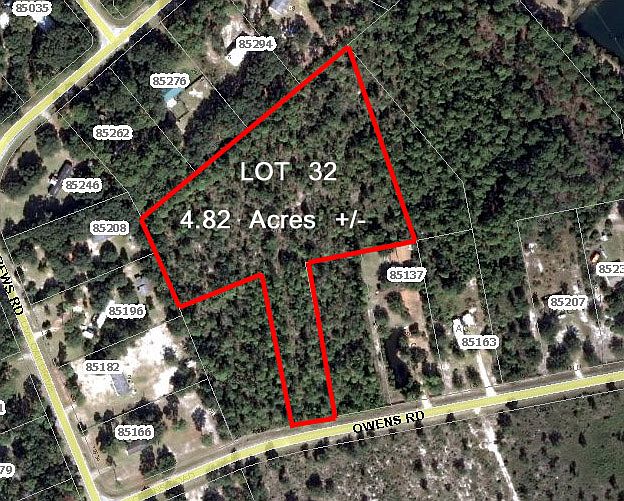 4.82-acre parcel of land with paved road frontage on Owens Road. Property is zoned OR (Open Rural) and is in preferred FEMA zone X. Perfect for a residential single family home or mobile home. This land is conveniently located to two Nassau County public boat ramps that provide deep water access at low and high tide to Nassau Sound. Horses are a permitted use in OR zoning. Approximate lot dimensions: 100x345x195x209x590x454x250x350+/- Please see attached survey sketch.