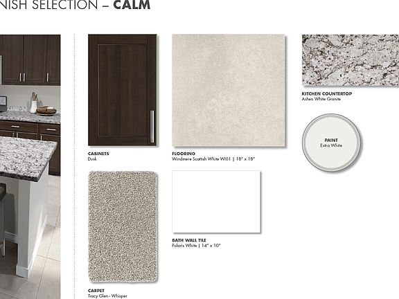 Prepare dinner with your family from this home's open kitchen which overlooks a spacious great room. Umber cabinets with Ashen White Granite countertops, Beclaire White stone-look tile flooring and warm beige carpet in our Calm package.