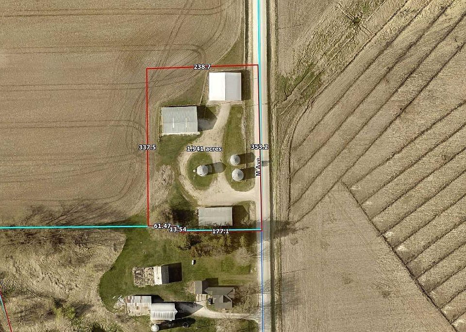 This 2 acre site includes two large machine sheds, and open shed and three grain bins. There is electricity to the site. Located one mile north of Hwy 93 on M Ave, Fayette. The seller will survey off approx 2 acres. The sheds are 54 x 75 and 60 x 68. The open shed is 36 x 72. Two grain bins are 24 x 18 and one is 21 x 18. The buyer is responsible for any fencing. There is fiber access.