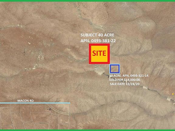 LARGE 40 ACRE PROPERTY LOCATED EAST OF HIGHWAY - 395 FOR SALE!!Between Adelanto and Kramer Junction off Macon Road. Bring your 5th Wheel, toys, bikes, ATV's and side by side to enjoy the open desert with beautiful trails and 360 panoramic view. Zone for sports shooting and animal. Off the grid and secluded property provide tons of privacy. Huge investment opportunity!! There is a 10 acre with APN.0493-321-14 Sold on 12/28/20 caddy corner from subject 40 acre that sold for $14,000.00 and $1,400.00 per acre. The subject land owner is only asking $1,250.00 per acre. You can buy this land in a discounted price. Hurry to submit offers!!