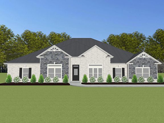 All brick Augusta Plan E is an open plan with a 3 car side entry garage backed by a 2-10 home warranty.. Home has 4 bedrooms, 3 baths and a sunroom. Home has wood plus flooring (Mohawk Revwood, Engineered Hardwood or similar product) in all living areas and bedrooms. Great Room features 12' ceiling with 8' tall doorways, extensive trim, gas-log fireplace with upgraded fireplace treatment, recessed lights and ceiling fan. Dining room has 12' coffered ceiling with 8' tall doorways, extensive trim including shadow box under chair rail. Open Kitchen has 12' ceilings with 8' tall doorways, soft close custom cabinetry and granite counter tops, large island with extra storage and countertop seating, stainless appliances (Gas Cooktop, Cabinet Vent Hood, Wall Oven, Wall Microwave, Dishwasher), tile backsplash, recessed and under cabinet lighting, and huge walk-in butlers pantry with cabinets on one side and storage on the other side. Optional less open kitchen available. Breakfast has 12' ceiling and extensive trim. Laundry has 9' ceiling, custom cabinets and tile flooring. Master bedroom has 11' double tray ceilings, recessed lighting, extensive trim and ceiling fan. Glamour Master bath has 11' ceilings, freestanding tub, large tile shower with double shower heads and rimless shower door, separate toilet area, double vanity with granite counter tops tile flooring and huge walk-in closet. Large sunroom has vaulted ceiling and ceiling fan. The additional bedrooms have 9' ceilings, ceil