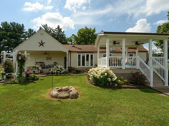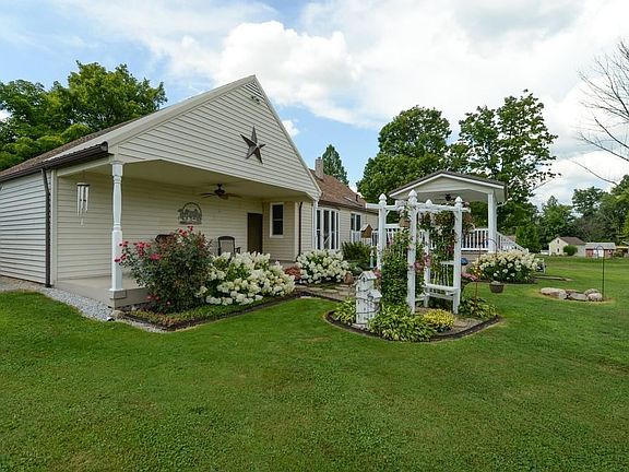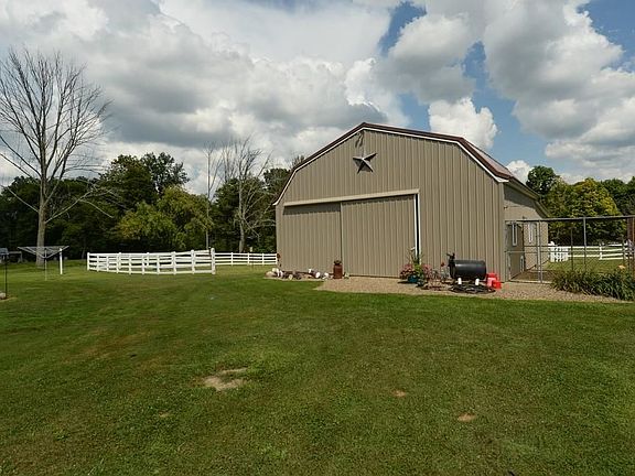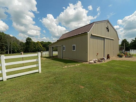 Well- cared-for Cape Cod offers 4.99 acres with 24x30 Barn with 2 stalls & Hay loft plus 24x20 Lean to shed. 2 acres of vinyl fenced pasture & 2 acres of woods. Inviting, beautiful backyard with covered patio, Azek Deck and unique pavilion overlooking backyard of flowering trees and bushes. Eat-in Kitchen with gorgeous Hickory cabinets & includes stainless steel newer appliances. Family Room with fireplace and slider to deck plus Living Room with large bay window. 1st Floor Master bedroom and additional Bedroom or could be office. Large 1st floor bathroom with tub/shower. 2nd Floor good size bedroom plus Loft area. Some update include: Waterproofed Basement, Barn & Vinyl fencing, Kitchen cabinets, vinyl decking, newer windows-glass block windows and back sliding door, furnace, HWT, New Septic ($19,500 w/fiberglass tank), Pressure tank, electrical panel, Clearwater filter system & Well pump.