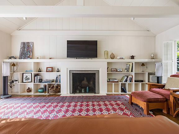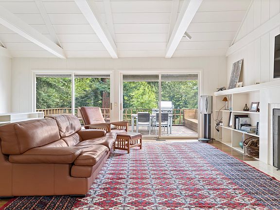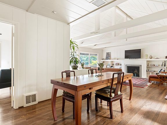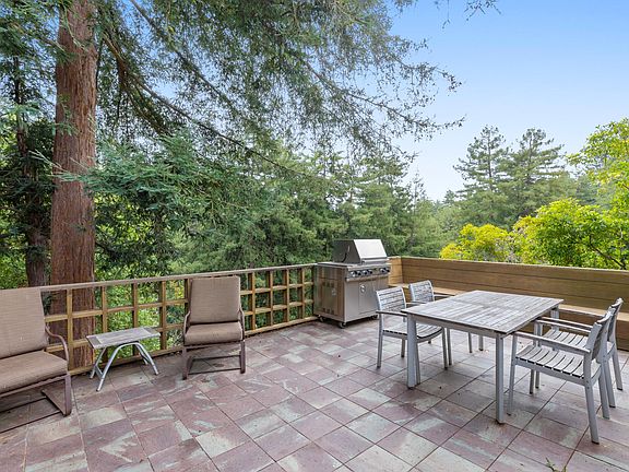 Special home with hardwood floors & built-ins throughout, high ceilings, garden setting, nestled in redwoods but with lots of sun and privacy. Quiet street. The sunken master has two walk-in closets & wrap wrap-around deck. The main floor has a large deck that is accessible from both the living room and upstairs bedroom/office, adding 300 sq ft to the living area. Lots of light and sun throughout. Mud room with pantry off kitchen for drying pets in the winter. Built-in couches in kitchen and guest bedroom.