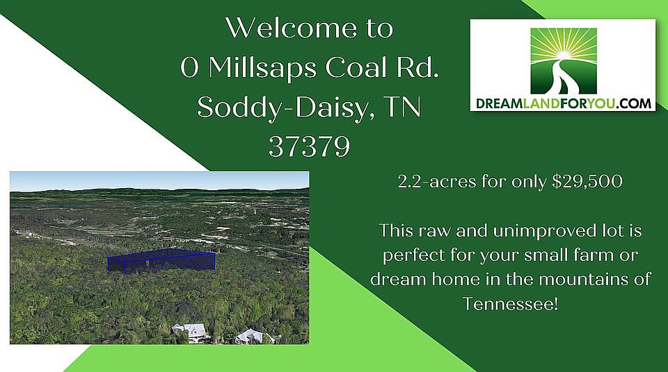 Enjoy the Scenic Views of Tennessee! This property is settled within 30 minutes of the beautiful Tennessee River, which boasts endless fun activities for the whole family. It is also surrounded by several National Parks and Forests. Enterprise South Nature Park is situated on 2,800 wooded acres that were previously a part of the Volunteer Army Ammunition Plant property and can be found less than 30 minutes from this lot! This park offers miles of walking paths, bicycle paths, a horse trail, and off-road biking trails. Chester Frost Park, the Tennessee Riverpark, and Montlake Golf Club are just some examples of the great, local amenities. Don’t miss out on the opportunity to live in this charming town in the great state of Tennessee. Property Summary Incredible 2.2 acre lot in Soddy Daisy, TN which would make the perfect building lot. This lot has the building potential for a dream home or farm! We are offering this property at a discounted ROCK BOTTOM cash price so that one lucky buyer can own the perfect property at a BELOW MARKET price. Property Details APN: 056__138.38 Property type: Acreage Zoning: A1(low density residential, intended for agricultural uses and single-family dwellings at 2 units per acre maximum) County: Hamilton Property Address:0 Millsaps Coal Rd(nearest address: 9448 Wedge Way Soddy Daisy, TN) GPS Coordinates (Approximate Center): 35.24459, 85.21667 City: Soddy Daisy Zip: 37379 Acres: 2.2 Square Feet: 95,832 Approximate Dimensions: 149’ x 563’ x 314’ x 463’ Topography: Wooded Mobile Homes Allowed Nearest Cities or Subdivisions: Soddy Daisy Chattanooga Annual Taxes: $83.65 Utilities Power: within ¼ mile of the lot EPB (423-648-1372) Water: within ¼ mile of the lot Northwest Utility District(423-332-2427) Sewer: WWTA Sewer Permits for septic(423-209-7810) Purchase Options We offer flexible seller financing for this property. If you choose this option, the price of this lot is $30,500. Cash Price: $29,500 Local Amenities Local Attractions: Chester Frost Park Tennessee Riverpark Montlake Golf Club Enterprise South Nature Park READY TO BUY OR HAVE QUESTIONS? Purchasing property from us is simple and easy. We have closed hundreds of real estate transactions and know the process well. We always use a 3rd party title company to make sure our buyers are protected and ensure title is free and clear. Message us here or call us today to get started.***call/text/email at 919-792-8443, deals@dreamlandforyou.com*** Disclaimer Buyer is responsible for verifying all information with the County as to what can and can't be done with the property. Buyer will need to work with the County to obtain the proper permits if needed. Buyer will also need to confirm the availability of any utilities needed or serviced on the property. Seller makes no warranties or representations about the land, its condition, or what can be built on the property.
