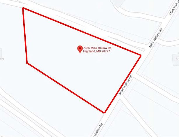 2 lots (1 acre + 0.7 acre) for less than the price of one in this area, excellent schools and location, includes a well, scenic and quiet area, walk to Patuxent river 250 yards away, address should be 7356 Mink Hollow Rd, Highland, MD 20777 Property boundaries shown for illustration purpose only but reflect the shape accurately