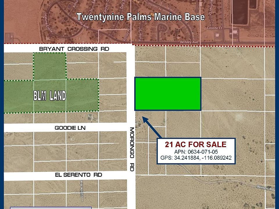 This 21 Acres is 660 ft south of 29 Palms Marine Base in Twentynine Palms CA. The property sits outside the city limits of Twentynine Palms and within the San Bernardino County. This property lies along a main paved road into the Marine Base housing, electricity runs along Morongo Rd across the street from the property. Morongo Rd is the border of the Twentynine Palms Water District, as such the property is not within the district. According the the County, the property is zoned Rural Living - 5 Acre Minimum. 'The RL (Rural Living) land use zoning district provides sites for rural residential uses, incidental agricultural uses, and similar and compatible uses.' One unit is allowed per 5 acres with accessory dwellings as allowed per the county code. The property could be subdivided into smaller parcels. GPS: 34.241884, -116.089242