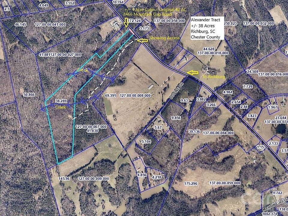 +/- 38 acre parcel of land available in the highly desirable Lewisville Schools district. Just a few minutes from Richburg, SC where many public amenities are located! Ideal property for a family compound or one secluded homesite with several homesites and plenty of room for a building, barn, or shop. Property consists of slight rolling terrain crossing two small creeks with young pines and hardwoods. An abundance of wildlife from deer, turkey, rabbits, squirrels, quail, and dove. No HOA or deed restrictions! Utilities such as power, fiber optic, and natural gas are located at the road for use. Conveniently located off I-77 SC Exit 62 to Charlotte, Rock Hill, Lancaster, Chester, and Columbia.