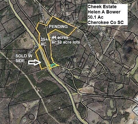 10 Acres portion of a larger 25 acres parcel described as: Ideal future commercial property and/or residential lot development land located on major four-lane highway. Paved frontage of 2500 feet. This tract is only 5 miles to I-85 and Blacksburg SC. Soils are well drained clay with gentle terrain. Tall planted pines dominate the property. They are ready for a second thinning or a final clearcut to provide cash flow. There is an old railroad easement thru the land that appears to be abandoned.