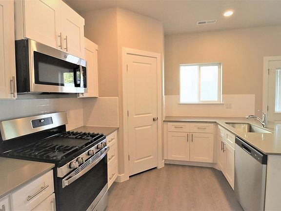 throughout the main level with an accent shiplap wall in the great area. Enjoy carpeted comfort on the stairs and in all bedrooms. This home boasts a convenient 2-car garage, a fully fenced private backyard perfect for outdoor enjoyment, and a covered patio. Enjoy serene views of sheep roaming in a beautiful grass field from the master bedroom.