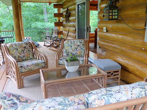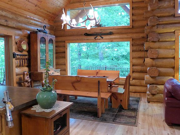 This log home is immaculate. Home features grand entry w/21' ceilings, large stone fireplace, open kitchen with peninsula bar along w/dining area that leads to outdoor entertainment area. Large wrap around porch with covered back area. Main floor master en-suite plus another main floor bath. Open staircase leads to large open loft & 2 bedrooms. Downstairs finished bdrm & bathroom along w/living room that walks out to the backyard. Welcome spring with your greenhouse. Beautiful private setting.