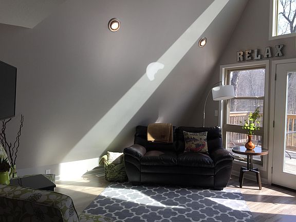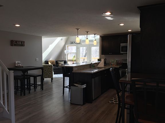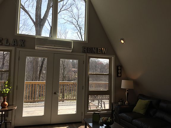 Lake, luxury, and relaxation come together in this beautiful lakefront A-Frame. It has been completely remodeled from head to toe with new appliances and amenities in 2017. It sits with a beautiful view in a protected cove on the North side of the lake, great for swimming and fishing! There are 2 bedrooms plus 1 loft bedroom and 2 full bathrooms. 3 Queen beds, 1 queen futon bed, and 1 full futon bed. There are 2 spacious outdoor deck areas, 1 off the main floor and 1 outside the the completely finished lower level, which is equipped with a 65 inch HDTV. There is a private path leading down to the waters edge and to a private dock large enough for 2 boats. If you are interested in renting this property for your lake vacation please visit www.lakehousevacations.com (ad #11253) to book.