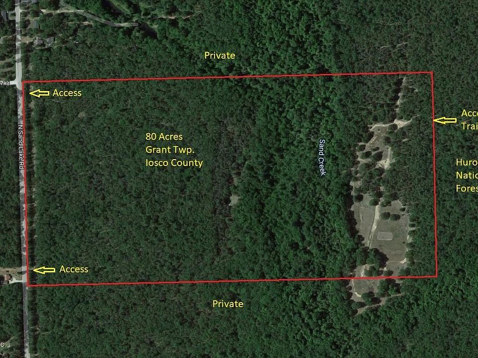 Here's 80 Acres of NE Michigan prime wooded hunting land! Great mixture of high, low, thick and open areas to setup on those bucks & gobblers! Natural water source with the Sand Creek running through the property as well! Sit in the elevated permanent well built blind overlooking food plots just outside of the thick cedar swamps! Access off of Sand Lake Rd to the West & a trail through the National Forest ground on the East side. Power lines run along the paved road for future easy power hookup if desired. Located in an easily accessible area on paved road between M-55 and beautiful Sand Lake! Don't wait and call me today! **Information is not warranted or guaranteed and aerial maps are a property layout & not a survey.