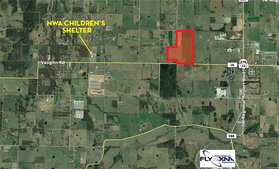 94.55 acres perfect for commercial development. Located near the intersection of Hwy 12 and Vaughn Rd and the Northwest Arkansas National Airport. 10 miles from the city of Bentonville. Rapidly developing area. Sewer installed at East boundary. Water & electric on-site Great location near XNA Airport & many new residential developments 1,971' of frontage on Vaughn Rd