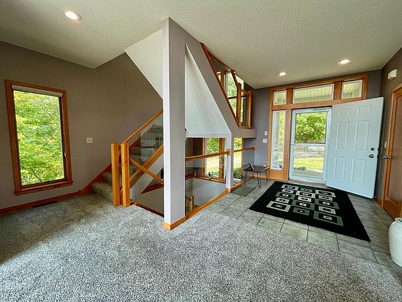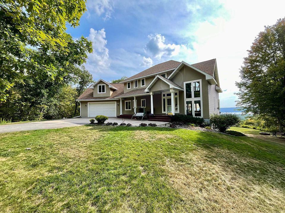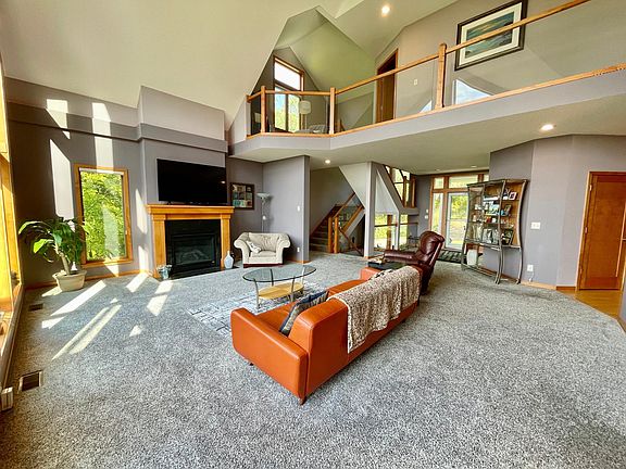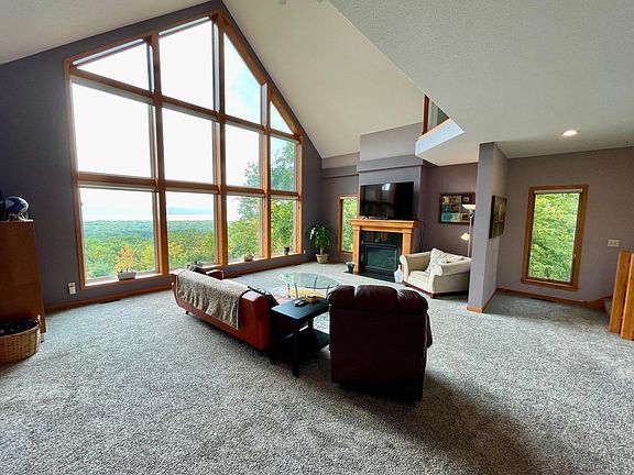 Welcome home! This artistic custom home on 4 acres, boasts panoramic views of Lake Pepin in a secluded setting where nature can be enjoyed all year around. This home offers ample living space with 4 bedrooms, 3 baths, a walkout basement and multilevel decking accessible on the back of the house. Large windows throughout allow natural light to pour in and the vaulted ceilings enhance the openness of the space. Cozy up to the gas fireplace on the main floor and delight in the landscape from the vantage point of the living room. The open concept kitchen features a walk-in pantry and dining area with a stunning view. The primary bedroom features a walk-in closet, a private upper deck, a vanity sink and a bonus office/living room area right off the room. A jack and jill bathroom is shared between the primary and second bedroom in the upper level. Lower level has a large family room for entertaining, a laundry room, a bathroom and two bedrooms. New roof August 2023 and fiber optic available.