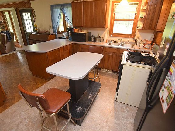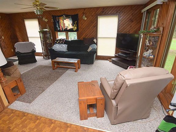 2-bedroom/2-full bath ranch on 10+ partially-wooded acres! Living room w/patio doors to small deck off front of house and floor-to-ceiling windows overlooking the backyard. Kitchen, dining area, one of the baths has a laundry area. Attached 2 1/2-car garage. New conventional septic system installed 2 years ago. Pig shed included.