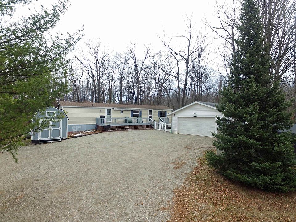 Northwoods getaway, dreams flow in this 2 bed, 1 bath mobile home. with spacious rooms, Bay window, Kitchen newly painted cabinets and newer rollouts in pantry cabinet, Updated bath with walk in shower. 8x36 deck with Shade awning, large 2 1/2 Stall detached garage. Four additional storage buildings 10x12, 7x7 Plastic, 8x12 tarp shed, 8x10 metal wood shed along the new flagstone path to the firepit area with privacy fence. Private trails throughout the property, go for a walk or take a ride on a four wheeler. Recently surveyed. Additional items of purchase would include 4 wheeler with plow and trailer, lawn tractor with lawnmower, bagger. Set on wooded lot on private road. Wick Built 14x60 home 1991, per Hud Tag. This property is not eligible for financing.