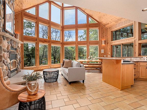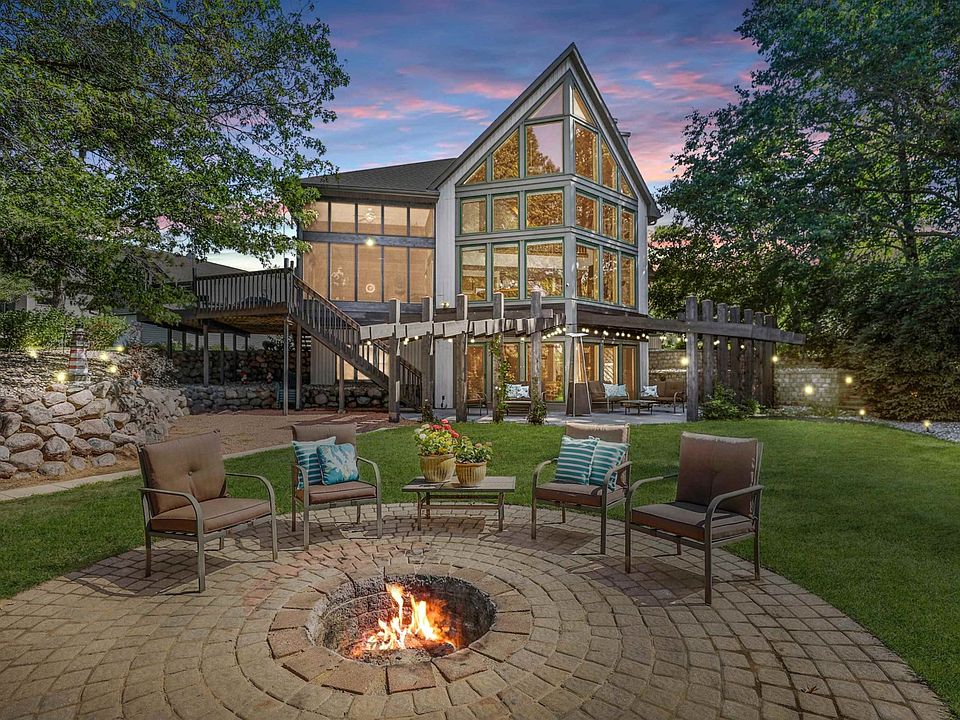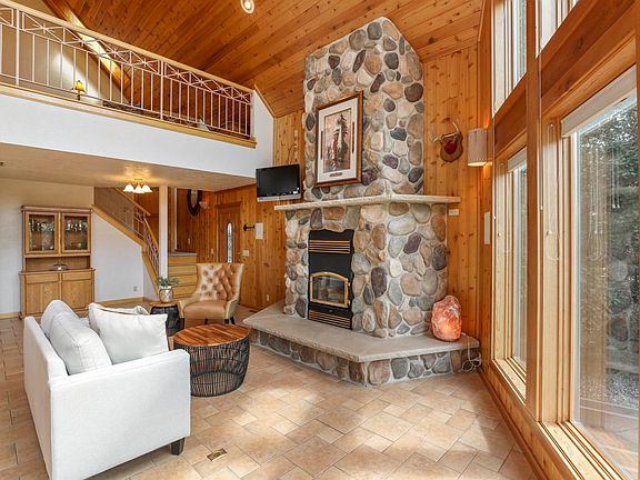 Gorgeous Legend Lake home with 130'+/- of sandy beach waterfront! Grand living rm greets you with a wall of windows with breathtaking views of the water. Floor to ceiling fieldstone masonry fireplace capable of heating the entire home is energy efficient and beautiful! Kitchen offers a snack island and large dining area. The screened in porch overlooks the water & features a wraparound deck. Main flr also has 1st flr laundry, 2 bedrms, main bath & 2.5 attached garage. Upstairs features a loft overlooking the great rm w/ water views. Loft accesses the primary BD with full BA. Walk out LL features a family rm with gas fireplace & hickory bar, 4th bedrm, 3rd bath. 4.5 car detached garage has epoxy floor and features a private Suite above with family rm, kitchenette 4th full bath 5th bedrm.