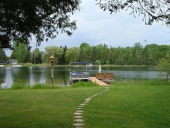 YOU MUST SEE THIS YARD!! Huge pines and Wolf Lake is the backdrop for this parcel consisting of over 8 acres with 500 ft of frontage, lovely 3 bed, 2 bath ranch home. Patio and screened porch overlooking the lake Lake level lot with mature trees. Georgeous views from the house and patio. Wolf Lake is a full rec. lake with great fishing and boating.
