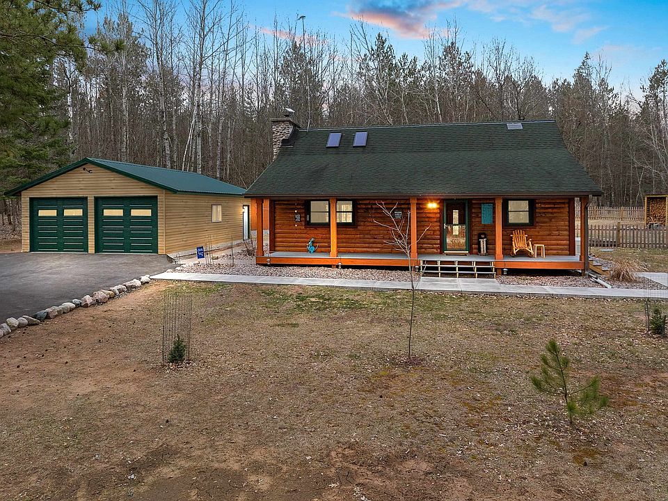 A perfect Northwoods retreat!. 3.63ac located on the outskirts of the Nicolet National Forest, next to ATV & Snowmobile trails. Sit on a new covered composite porch & back deck w/pergola, relax & take in wildllife! Open concept LR w/soaring ceiling, skylights, field stone fireplace! LVP flooring from updated foyer thru LR, New SS Appliances & refinished kitchen cabinets, dining area overlooking patio. 2 nice size bedrooms w/ new sliding barnwood doors & Open staircase to upper loft. Full bath on main with addtl w/in shower and sink in lower. New 2.5 stall 24x32 det garage, additional 1.5 stall detached garage, new blacktop driveway & paved walkway, fenced in yard, new 14k generator, and more! Close to hunting, waterways, & more. 24hr binding acceptance required