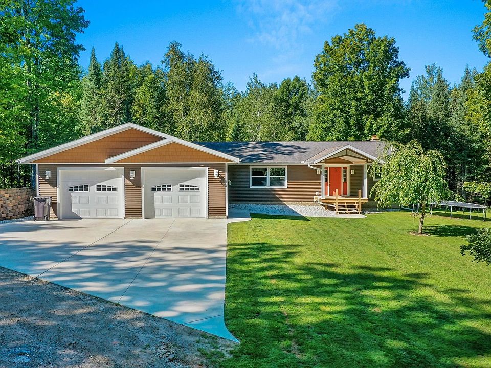 Quality built 3 bed, 3 bath ranch style house nestled on 2 acres of peaceful wooded paradise. Featuring a split-level floor plan which offers privacy for the master suite, spacious open concept kitchen, dining and living room with recessed lighting. Main floor laundry for added convenience. Master holds a walk-in closet & private ensuite with stand up shower and large jetted soaking tub. Patio doors lead you out to the upper deck overlooking your private back yard. While the lower level offers a fully finished entertaining area and walkout basement, This dreamy home boasts multiple spacious and beautifully designed spaces, perfect for hosting unforgettable gatherings. The two-car attached garage ensures the utmost convenience for you and your vehicles. Don't pass up on this one!