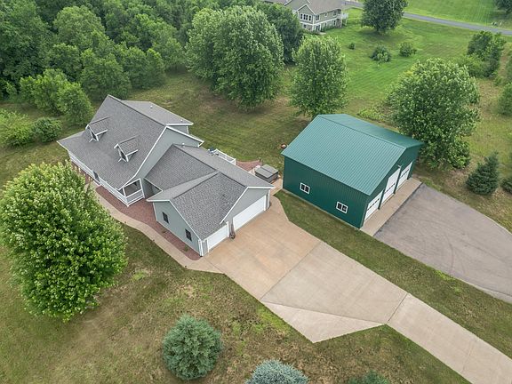 Discover spacious serenity on 1+ acre in this stunning 4BR, 3.5BA home. The thoughtful, inviting flr plan showcases attractive flooring, warm recessed lighting, a cozy 2-way stone fireplace between living rm & kitchen & expansive windows that reveal nature's views. Cook & connect in the stylish kitchen w/an island that seats 3-4, enjoy a main-floor laundry, a main-floor master suite w/dual sinks, walk-in shower & walk-in closet. Step out to the semi-private backyard w/hot tub access from dining area. The lower level features a family rm w/wet bar, ideal home office, great finished flex space & generous storage. Don't miss the heated 3-car garage w/dual basement entry PLUS 1400+ sq ft pole shed w/oversized doors! No subdivision, no restrictions—just fresh air & a home built for life!