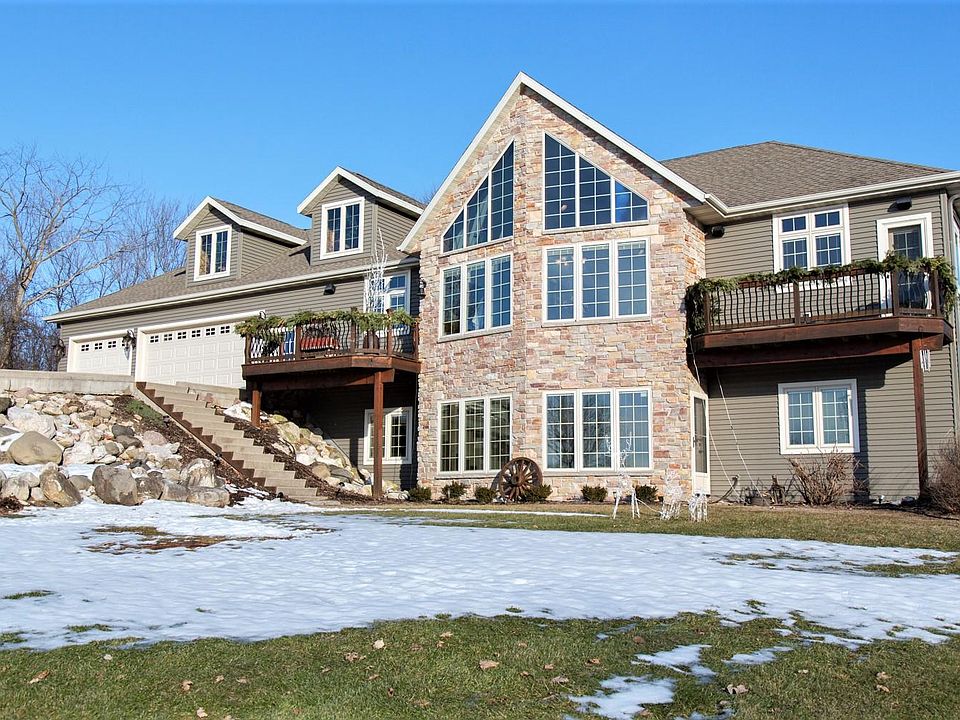 Stunning custom built 4-bedroom w/ an office & 2.5 bath home. Master en-suite offers both a shower & whirlpool. Quality throughout includes custom cabinetry, floor to ceiling stone fireplace -matches the stone outside home. Pella w/ ''between the window blinds'' allows you to control privacy w/ low maintenance. Stone back-splash & granite counter tops anchor the kitchen, stainless steel appliances & a gas stove top. Laundry will be a delight in the over-sized laundry/mud room, conveniently located off the kitchen. Plus a 3.5 car attached garage & an additional 2-story 5.5 stall garage w/ 2x6 construction. Main floor-storage galore while the 2nd level is roughed & waiting for your finishing ideas. This phenomenal home sits on a 6 acre parcel just minutes from downtown Kiel!