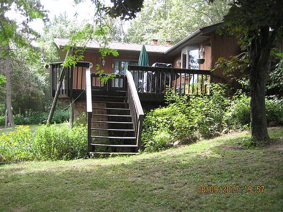This move-in ready home features main floor master bedrm with master bath, bedroom, full bath, open concept kitchen/ dining/ living rm with beautiful wood burning fireplace. Full, finished, walk-out basement has wood stove, laundry rm, living rm, and ample room for guests to sleep and enjoy the lake view. Detached 2 car garage, drilled well, and conventional septic that was installed in 2020. Nicely manicured lawn and 132 ft of lake frontage to enjoy. Property is being sold to settle an estate and all furnishings, dock, pontoon boat and trailer are included!