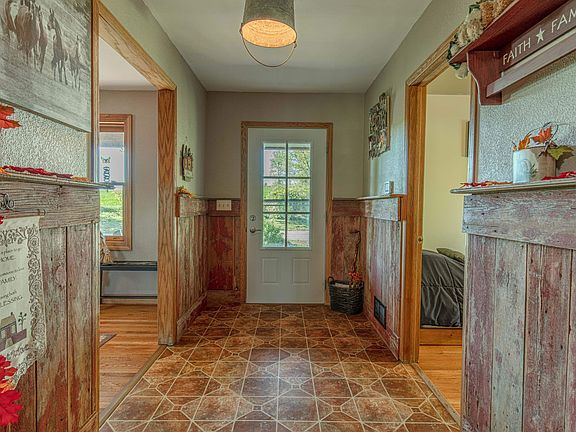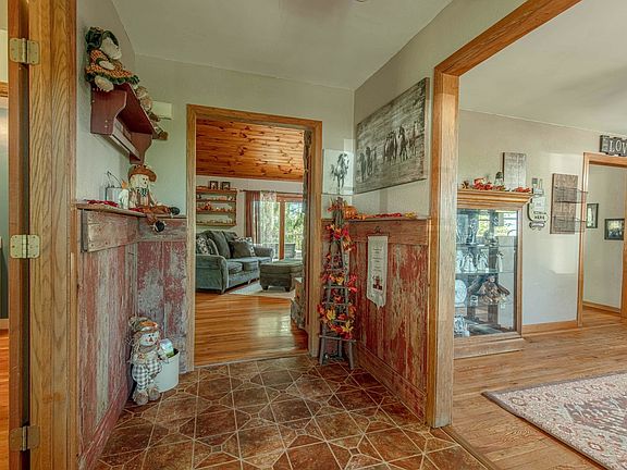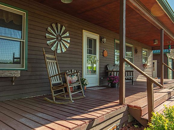 Discover this tranquil country retreat on 6 beautiful acres with your very own picturesque pond. This ranch-style home boasts a spacious living room with vaulted ceilings and a cozy stone fireplace, perfect for chilly winter nights, along with a walk-out to the deck. The kitchen offers a tile backsplash, ample cabinets, and plenty of counter space! Enjoy multiple dining areas, ideal for gatherings. The primary bedroom features a private walk-out to the deck and a luxurious ensuite bath. Convenience is key with main floor laundry and a home office. The finished lower level includes a large family room and two additional bedrooms, ideal for guests or family. A 2-car garage and 2 sheds provide ample storage for all your needs. Come to the country!
