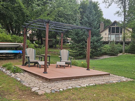 Enjoy this inviting 4-bedroom, 2.5-bath waterfront home just steps from the sandy beach. The open-concept living area features cathedral ceiling, a cozy fireplace, and hickory kitchen cabinetry. Relax or entertain on the wraparound deck while taking in stunning westerly sunsets. The walk-out lower-level family room provides flexible living space, with convenient laundry located in the lower-level bath. A drilled well installed in 2017 offers added peace of mind. A 34'×30' heated and finished garage with walk-up storage, built in 2020, provides ample room for vehicles, storage, or hobbies. A perfect waterfront getaway!
