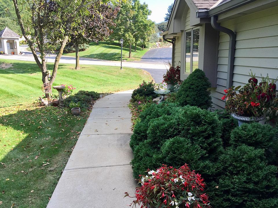 An end ranch unit makes this very private w/lots of green space & overlooking pond & fountain. Zero clearance entries, NO STEPS. . Updated tile floors, paint, carpet. & 2 rooms w/new wood floors. Kitchen w/Corion counters, wood floors, Finished lower level with family room & 2nd Fire Place, 2nd & 3rd bedroom and flex room (4th bedroom or office). Well maintained & cared for non smoking home. Lots of windows and sun. Peaceful & serene setting. Abundant Green space & privacy w/lots of windows & light thanks to an end unit!! Close to 94 & Hwy 83 & all it's shopping & conveniences. Close to Pewaukee Lake, golf course, and many dining choices. Surround sound, sec system. All appliances, washer & dryer! New roof too.