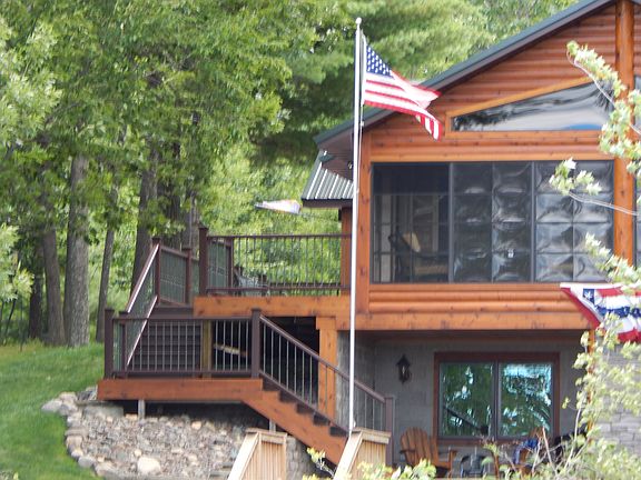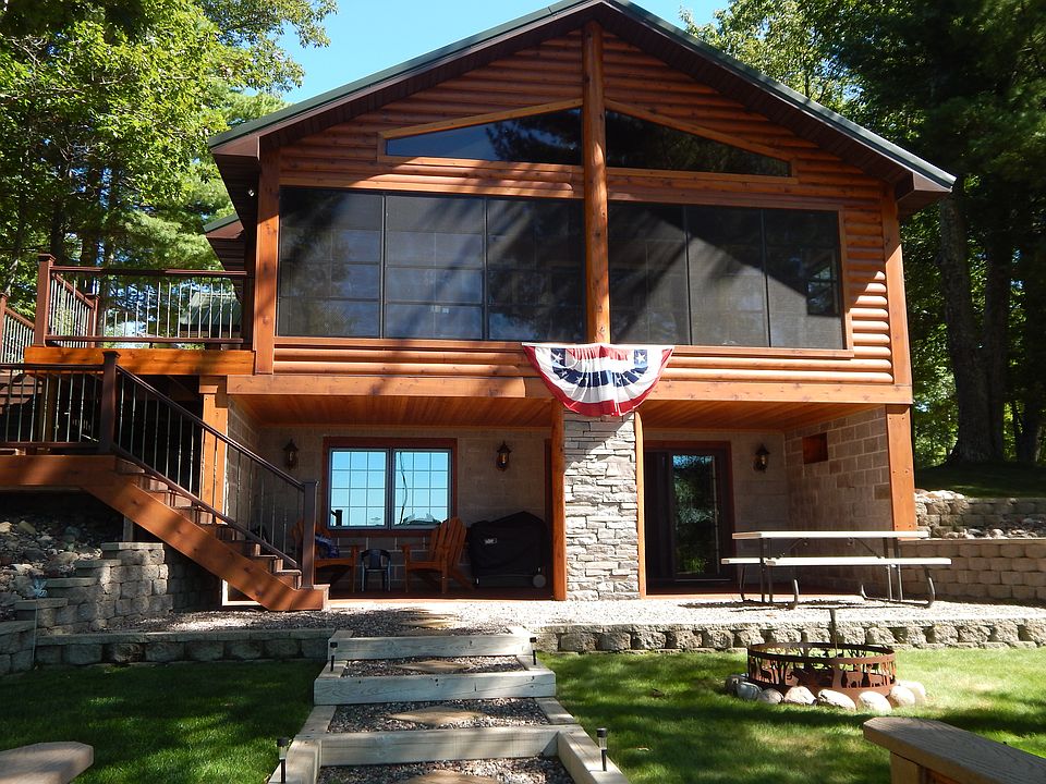 4 bedroom/ 3 bath Lakefront Home This beautiful log sided home is situated on a splendid wooded lot featuring 140 feet of sandy frontage on Round Lake-part of the Pike lake Chain of Lakes. Built in 1995, this home has been completely remodeled inside and out with a cozy Northwoods décor. Quality materials and craftsmanship in every inch! An open concept livingroom, kitchen and dining area offer an inviting stone gas fireplace, vaulted pine tongue and groove ceiling with lodge poles, hickory cabinets, island and stainless appliances. Two sets of French doors lead to a beautiful three season sun room with gas fireplace and western exposure for the best sunsets you will ever see! Also, on the main floor, is the master bedroom with full bath and walk in closet and slider to private deck. There is also another bedroom and hallway bathroom. The finished lower level walk-out family room features a Blaze King wood burning stove and sliding door to a covered concrete patio and fire pit. There are also two bedrooms, full bath, office area and utility/laundry room. The home includes: Metal roof, a finished and heated two car-attached garage with pull down stairs to extra attic storage, concrete drive area for patio/parking, 10 x 38 deck with Trek decking, 28 x 36 Metal Cleary building with bonus room for storage, bunkroom or workshop. This property is located between Minocqua and Park Falls and offers year round recreational opportunities (snowmobiling, atv-ing, hunting, fishing, boating, etc) as it is surrounded by thousands of acres of Chequamegon National Forest land. The Pike Lake Chain is a four lake chain. Pike, Round, Amik and Turner. Additional items also available for purchase are: Floe Aluminum roll in docks, 22 foot Premier Pontoon boat and boat lift and furnishings..